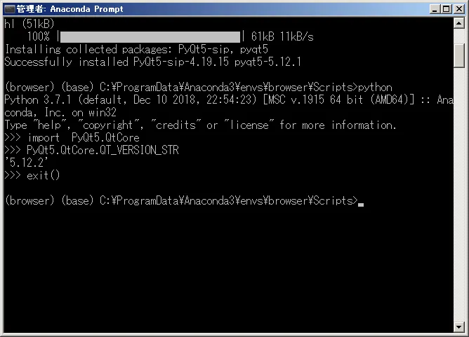 今回はPyQt5がインストールできているか確認するために、PyQtのバージョンを確認する下記を入力してください