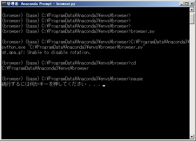 ここでは、仮想環境で作成したbrowserフォルダ内にbrowser.pyというファイルを保存して実行します